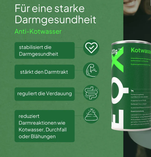 EQX Anti-Kotwasser ist ein natürliches Ergänzungsfutter, das die Darmfunktion deines Pferdes unterstützt, die Verdauung stabilisiert und bei folgenden Problemen hilft: