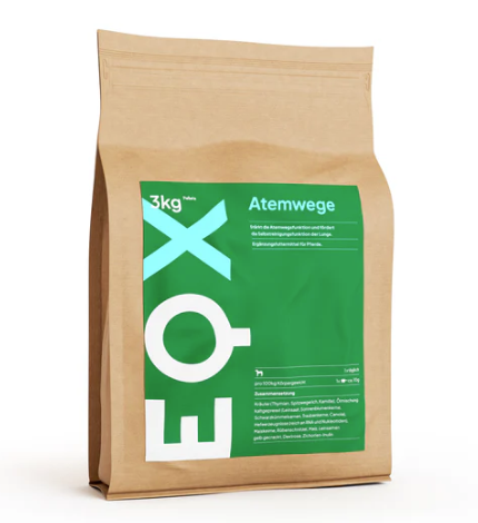 EQX Atemwege ist das Ergänzungsfuttermittel für Pferde mit Atemwegsproblemen. Die bewährte Rezeptur einer hochwertigen Kräuterformel trägt zur Erhaltung der normalen Schleimhautfunktion in den Atemwegen bei und fördert damit ein gesundes Atemwegssystem. Unsere staubfreien Pellets sind besonders geeignet für Pferde, die sensibel auf ihre Umgebung reagieren und zu Allergien oder Atemwegsproblemen neigen.