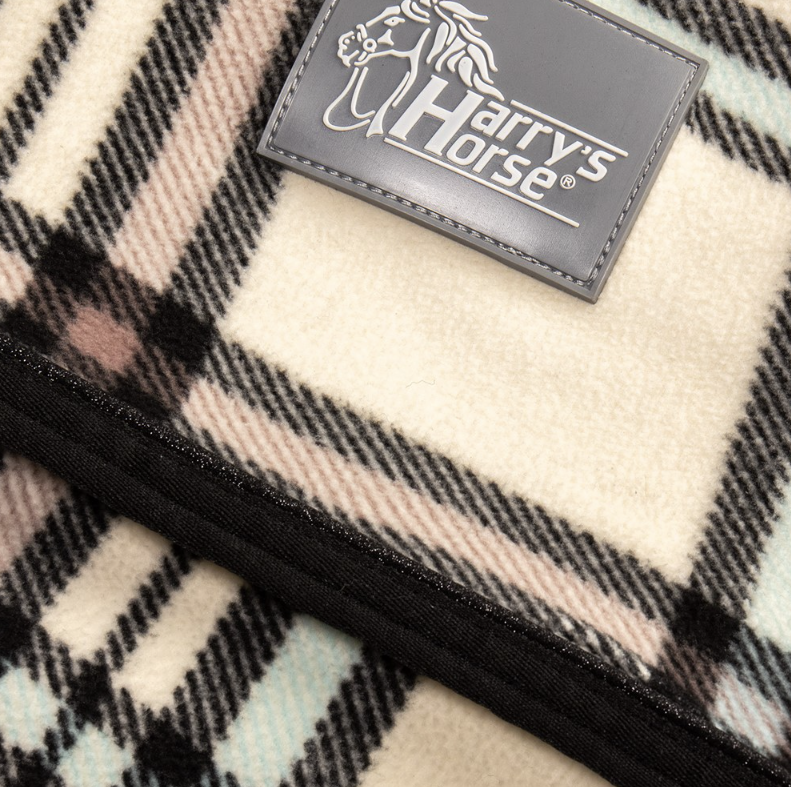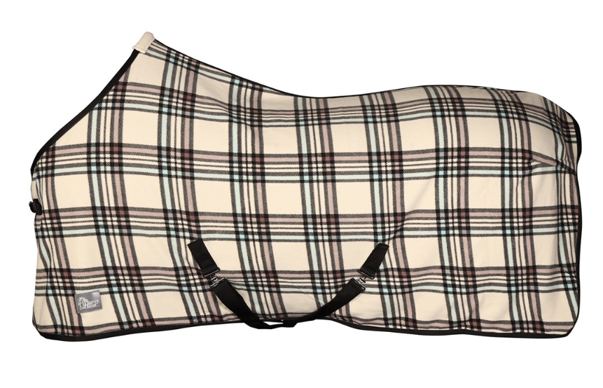 Fleecedecke mit frischem Karomuster und einer dezenten glitzernden Biese. Ausgestattet mit einem einfachen Brustverschluss, Kreuzgurten und einer Schweifschlaufe.