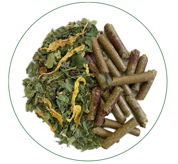 Zusammensetzung: 90% Kräuterheu, 10% Saisonmischung „Frühling“ (Löwenzahn, Brennnessel, Petersilie, Hagebutten geschnitten, Randen, Birkenblätter, Sonnenblumenblüten)